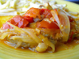o atum em bifes, e o tomate, os alhos e as cebolas em rodelas.